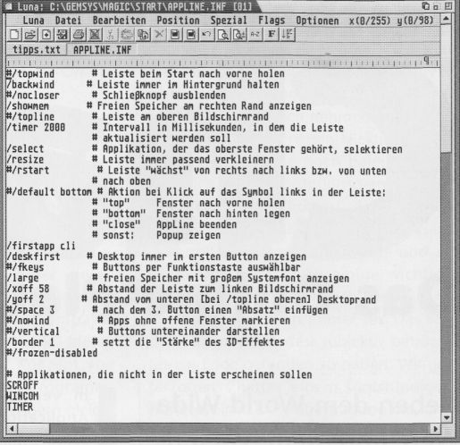 Der Schlüssel zum Erfolg ist die Datei APPLINE.INF, die Sie im demselben Verzeichnis finden, in dem auch das Hauptprogramm liegt. Laden Sie nun Ihren Lieblings-Texteditor (oder ziehen Sie die Datei einfach auf dessen Piktogramm) und schauen Sie sich etwas in dem File um. Lassen Sie sich nicht abschrecken von den vielen kryptischen Begriffen - so schlimm ist es gar nicht! Der erste Eindruck mag entmutigen, jedoch ist die Konfigurationsdatei bei genauerem Hinsehen recht übersichtlich aufgebaut.