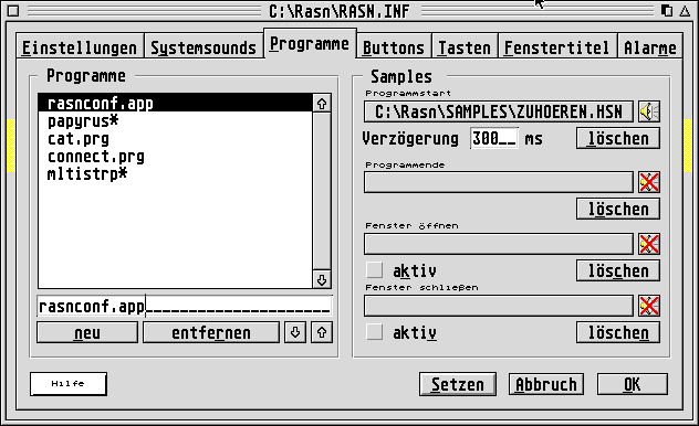 Das Konfigurationsprogramm von Rational Sounds kann entweder direkt aus dem Programmverzeichnis oder als CPX-Modul gestartet werden. Es ist Ă€uĂerst ĂŒbersichtlich und attraktiv gestaltet, sodass es gleich SpaĂ macht, mit eigenen Einstellungen herumzuspielen. Die verschiedenen Unterpunkte (Einstellungen, Systemsounds, Programme, Buttons, Tasten, Fenstertitel und Alarme) sind ĂŒber Karteireiter aufrufbar - besser geht es nicht mehr. Die Bedienung ist dabei immer transparent gehalten: In der linken Fensterhilfe stellt ein ScrollmenĂŒ die zu belegenden Systemereignisse dar, rechts davon kann diesen ĂŒber einen Button ein Klang zugeordnet werden. Ein geladener Sound kann durch Anwahl jederzeit gestestet werden. FĂŒr weitere Einstellungen (Zeitansagen etc.) stehen AufklappmenĂŒs bereit. Die exzellente Sprechblasenhilfe hilft bei Fragen, zusĂ€tzlich steht auf Abruf eine Online-Hilfe im ST-Guide-Format zur VerfĂŒgung.
