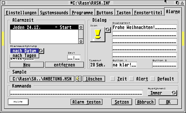 Besondere Beachtung verdient in jedem Fall der Karteireiter âAlarmeâ, der eine weitere praktische Funktion von Rational Sounds offenbart: Das Programm ist als orgineller Wecker einsetzbar. So kann eine freie Alarmzeit nach Tag und/oder Datum bestimmt und mit einem Klang versehen werden. So entgeht Ihnen kein wichtiger Termin mehr -endlich ist der Hochzeitstag gerettet!
