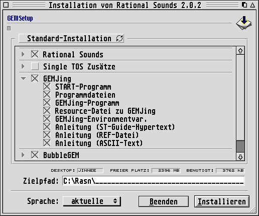 Auf die Platte damit! Und noch einen Standard verwendet Rational Sounds: die Installation mittels GEMSetup. Die verschiedenen Komponenten können also einfach und individuel zusammen gestellt werden. Auch GEMJing wird auf Wunsch gleich mit installiert. NatĂŒrlich gilt es vor der Installation zu bedenken, dass eine Partition ausgewĂ€hlt werden sollte, die genĂŒgend Platz fĂŒr dem umfangreichen Ordner mit dem Samples bietet. Das Hauptverzeichnis belegt ca. 3.6 MBytes auf der Festplatte, ein weiteres Verzeichnis mit KlĂ€ngen ca. 1.3 Mbytes. Da Atari-Anwender traditionell dazu neigen, eher kleine FestplattenkapazitĂ€ten zur bevorzugen, sollte also eventuell etwas Platz frei geschaufelt werden.