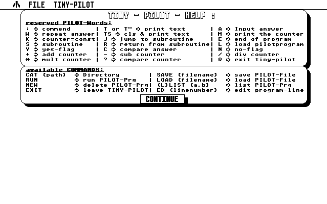 Auch Tiny-Pilot ist ein Pilot-Interpreter, jedoch kann im Moment noch nicht abgeschätzt werden, ob diese Version ähnlich leistungsfähig wie das Taylor-Pilot ist. Fest steht, das die Befehlserweiterungen von Pilot Atari auch der Neuauflage von Tiny-Pilot zukommen werden. Tiny besitzt keinerlei Dokumentation, aber ein Hilfsbildschirm zeigt alle möglichen Pilot-Befehle. Programme können direkt im Interpreter eingegeben werden. Ein Beispielprogramm ist mitgeliefert und stellt einen einfachen, wenn auch nicht gerade pädagogischen Spanisch-Vokabeltrainer dar.