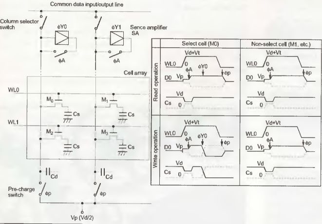 Um ein Bit auszulesen, geschieht nun folgendes: Zunächst muss ein sogenanntes Precharge (vorher laden) ausgeführt werden. Dabei werden alle Datenleitungen mit der halben Spannung für logisch 1 geladen, also beispielsweise 2.5V wenn der Chip mit 5V arbeitet. Die hierfür benötigte Zeit heißt Precharge-Time. Währenddessen wertet der Zeilendekoder im Speicherchip die Zeilenadresse aus und selektiert nach dem Precharge die passende Wordline (WL) mit einem Spannungsimpuls. Sämtliche Transistoren dieser Page leiten nun. Der geladene Kondensator sorgt jetzt dafür, dass sich die Spannung auf der Dataline leicht ändert, je nach Ladezustand also leicht kleiner oder leicht größer wird als die vorherigen 2.5V. Am Ende der Dataline kommt nun der Sense Amplifier zum Zuge. Dieser nutzt die Precharge-Spannung als Referenzspannung und wandelt die dazu negativere Spannung in 0V und die dazu positivere Spannung in 5V um. Je nach Spaltenadresse wird der Inhalt der gewählten Speicherzelle nach außen ausgegeben. Jetzt besteht allerdings das Problem, dass sich alle Kondensatoren einer Page entladen haben, und somit deren Inhalt zerstört wurde. Als Konsequenz müssen all diese Speicherzellen wieder beschrieben werden. Also sorgen die Sense Amplifier nach dem Lesen dafür, dass auf sämtlichen Datenleitungen die ausgewertete Information wieder als 0V bzw. 5V vorzufinden ist. Der Kondensator lädt sich schließlich mit dieser Spannung auf und hat somit wieder die korrekte Information gespeichert. Um ein Bit zu schreiben, muss man genau so vorgehen, wie beim Lesen. Nur werden hier nach dem Lesen der Page keine Daten nach außen weitergeleitet, sondern von außen gelesen, um sie anschließend auf die selektierte Dataline weiterzuleiten. Würde man vor dem Schreiben eines Bits nicht die ganze Page auslesen, so ist klar, dass dann bis auf das eine geschriebene Bit alle anderen Informationen in der Page verloren gingen. Bei einem Lese- bzw. Schreibzugriff werden also immer alle Speicherzellen einer Page gelesen und wieder zurückgeschrieben, auch wenn sie nicht benötigt werden.