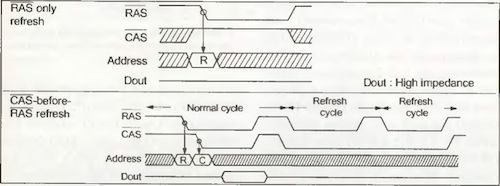 - RAS only Refresh: Bei der Ansteuerung des DRAMs geht man zunächst so vor, wie bei einem Lesezugriff. Nur übermittelt man nach der Zeilenadresse keine Spaltenadresse mehr, lässt also das /CAS-Signal inaktiv. Das DRAM führt daraufhin in der angelegten Zeile ein Refresh durch.