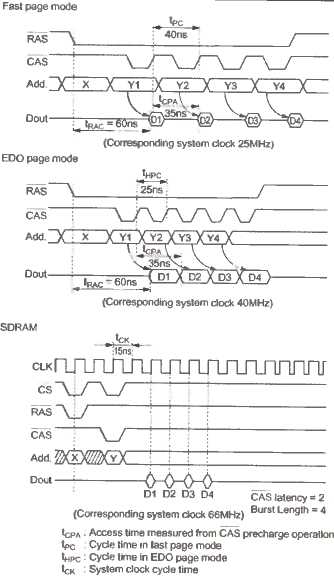 Die nächste logische Konsequenz ist, dass die Lese- und Schreibverstärker nicht nach jedem Zugriff auf die Speichermatrix die gerade gelesenen Daten wieder zurückschreiben, sondern erst beim Wechsel der Page. Dadurch entfällt im Burstmodus die RAS-Precharge-Time womit sich die CAS-Zykluszeit verringert. Die so optimierten Page Mode DRAMs sind als Fast Page Mode DRAMs (FPM-DRAM) bekannt und kamen beispielsweise im TT und Falcon zum Einsatz. FPM-DRAMs haben aber weiterhin den Nachteil, dass das /CAS-Signal angibt, wie lange ein Lesezyklus dauert. Dadurch hat man nicht die Möglichkeit bereits die Spaltenadresse des darauffolgenden Zugriffs zu übergeben. Dies kann erst geschehen, wenn die Daten auf dem Datenbus zurückgeschrieben wurden. Und genau bei diesem Punkt setzen EDO-DRAMs (Extended Data Out) an. Hier übernimmt das /OE-Signal die Aufgabe, das Ende eines Lesezyklus anzuzeigen. Mit dem /CAS-Signal kann daher bereits die nächste Adresse übertragen werden, während auf der Datenleitung noch das zuvor ausgelesene Datum zu finden ist. Durch dieses leichte Paralleli-sieren des Zugriffs (Overlap), ist es möglich, die CAS-Zykluszeit bei 60ns-DRAMs von 40ns bei FPM-DRAMs auf 25ns bei EDO-DRAMs zu verkürzen. Hieraus resultierend kann ein EDO-DRAM bei Burst-Zugriffen und einem Bustakt von 40MHz jeden Takt Daten liefern, während ein FPM-DRAM dies nur bei 25 MHz schafft. Es sei jedoch angemerkt, dass die Beschleunigung von EDO gegenüber FPM nur beim Lesen gilt. Beim Schreiben jedoch ist ein Overlap nicht möglich. Die Weiterentwicklung von EDO-DRAMs trägt die Bezeichnung BEDO (Burst Extended Data Out). Da die angeforderten Daten meistens sowohl in einer Page als auch direkt aufeinanderfolgend in einer Zeile liegen, überlässt man BEDO-DRAMs, nachdem man die Spalten- und Zeilenadresse angelegt hat, sich selbst. Der Speicherchip generiert sich intern die neuen Spaltenadressen durch einen Adressgenerator und liefert die geforderten Daten synchron zum /CAS-Signal, wodurch eine erneute Verringerung der CAS-Zykluszeit ermöglicht wird. Somit können BEDOs bei 66 MHz Bustakt mit einem 5-1-1-1 Burst dienen und sind damit den normalen EDOs deutlich überlegen. Doch trotz des guten Konzepts konnten sie sich - insbesondere wegen dem schnellen SDRAM - nie durchsetzen und waren demnach auch nur kurze Zeit am Markt vertreten.