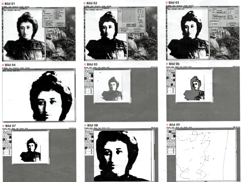 Ich habe mir als Motiv Rosa Luxemburg ausgesucht. Das Bild habe ich von einem Buchumschlag eingescannt und als TIFF-Datei in das Bildbearbeitungsprogramm Chagall geladen, um es für die Vektorisierung vorzu bereiten (Bild 01).