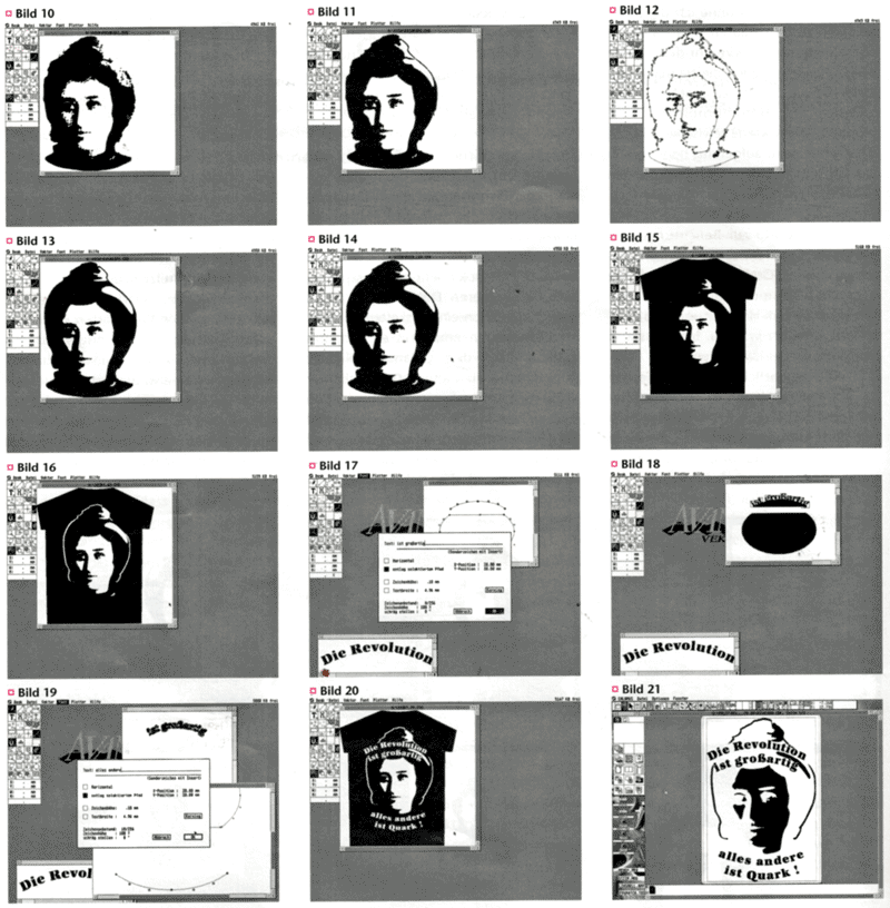 Ich wähle im Textmenü die Schrift Antiqua, weil sie von ihrer optischen Wirkung gut zu den zwanziger Jahren, der Zeit in der Rosa Luxemburg bekannt wurde, passt. Beim Satz oben herum muss man nichts weiter beachten, nur das Kreisstück muss angewählt sein. Ich mache diese Satzarbeiten in einem zweiten Fenster, aus dem ich die fertigen Textstucke dann in die eigentliche Grafik kopiere. Beim Setzen des unteren Textes in den Kreisbogen muss ich zuerst die Laufrichtung durch Klicken von [R] wie „Richtungsfunktion" ändern. Das leere Pfad-Ende wird nun zu einem schwarzen Punkt. Im Textmenü muss ich dann noch den Buchstabenabstand vergrößern, da die Lettern sonst „zusammenkleben" wurden.