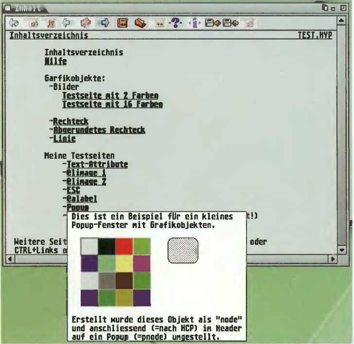 Ein in ST-Guide-Dokumenten nicht sehr häufig genutztes Feature ist die Möglichkeit, auf Mausklicks Popups zu öffnen, in denen sich z.B. Begriffsdefinitionen etc. befinden können. Ein Hauptgrund für die häufige Ignorierung dieser Funktion war nicht zuletzt der Umstand, dass sie multitaskingfeindlich agierte und bei einem Aufruf den Rechner während eines geöffneten Popups lahmlegte. Um dies zu umgehen, bringt Hyp_View Popups in einem eigenen Fenster ohne Randelemente unter. Diese agieren applikationsmodal. Die Menüzeile bleibt also aktiv, außerdem werden parallel laufende Applikationen nicht mehr blockiert.