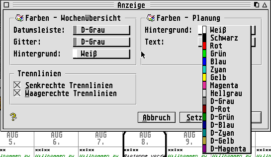 Eine der ersten Funktionen, die nach der Modernisierung des Hauptprogramms hinzu kamen, ist der Anzeige-Dialog. Hier können die Farben den eigenen Wünschen angepaßt werden. Das fängt an mit den Texten in der Datumsleiste, der Gitterfarbe und dem Hintergrund der Wochenübersicht. Im Planungsfenster kann derzeit nur der Hintergrund verändert werden.
