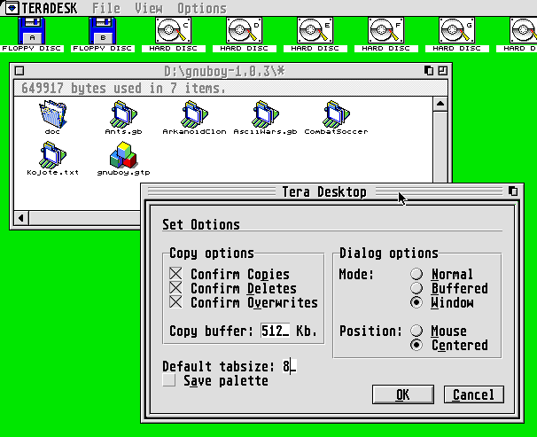 Der ungeteilten Aufmerksamkeit kann sich Teradesk aber jetzt sicher sein: es ist der erste Open-Source-Desktop für den Atari. Wie sehnlich dieser erwartet wurde, zeigte sich schon daran, dass Henk Robbers sich bei Joakim Högberg schon vor dem Erscheinen auf TOPP das Programm sicherte. Das bedeutet natürlich nicht, dass ihm das Programm jetzt gehört. Auch an anderer Stelle löste die Neuigkeit Freude und erhöhte Entwicklungstätigkeit aus: Martin Doering, einer der Programmierer des Open-Source-TOS "EmuTOS" hat großes Interesse daran, sein TOS mit einem vernünftigen Editor auszustatten. Dies ist nicht weiter verwunderlich, denn momentan steckt im EmuTOS der einzige Open-Source-Desktop, der schnell an den Atari anpassbar war: der PC-GEM-Desktop. Dieser Desktop kennt jedoch nur zwei feste Verzeichnisfenster, was in der Praxis eher an eine grafische Version des Norton Commander erinnert als an einen Desktop. Nun soll also Teradesk Bestandteil von EmuTOS werden und eventuell wird sich auch so mancher ST-Besitzer demnächst EmuTOS in Eproms brennen lassen, um es im ST zu benutzen.