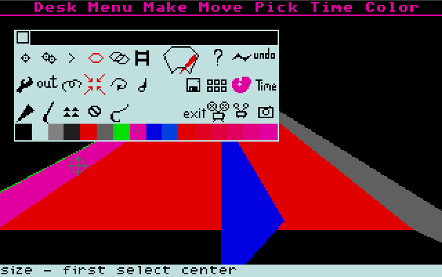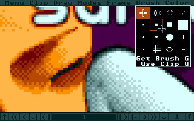 Eine der Verbesserungen an Animator ST ist das Color Cycling. Damit wird ein Teil der Farbpalette rotiert, eine Technik, mit der schon Neochrome Animation erzeugte (z.B. bei dem berühmten Wasserfall). Das größte Manko an dem frei erhältlichen Animator ist das fehlende Handbuch. Aber selbst dieses findet sich im Internet, denn es gab schon früher Leute, die ganze Handbücher abtippten. Darin erfährt man auch mehr über das Einstiegsmenü und die Dialogboxen, die 1:1 vom Amiga übernommen wurden. Es gibt auch eine Menüleiste, die erscheint, wenn am oberen Bildrand die linke Maustaste gedrückt wird.