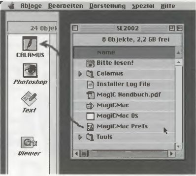 Da Sie „MagicMac" als Mac-Programm bereits gestartet haben, gibt es auch eine Datei „MagicMac Prefs". Sie befindet sich im Mac OS-Systemordner unter „Präferenzen" oder „Preferences". Verschieben Sie diese in den Ordner „SL2002". Calamus wird künftig mit Doppelklick auf diese Datei gestartet. Dazu ist es zweckmäßig, die Datei oder ein Alias derselben dorthin zu verfrachten, wo Sie Ihre anderen Programme starten (Klickstarter, Userordner oder ähnliches - siehe Bild rechts. | Sie kann ab jetzt beliebig umbenannt und iconifiziert werden.