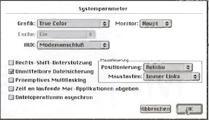 Klicken Sie auf „OK". Es erscheint das Systemparameter-Fenster. Wenn Sie QuickDraw, Speed-Doubler und NVDI installiert haben, können Sie ohne Geschwindigkeitsverluste den TrueColor-Modus wählen. Verwenden Sie nur den Schalter „unmittelbare Dateisicherung". Der (Mac-| Drucker beginnt mit der Arbeit erst, wenn alle Seiten übergeben wurden (das geht ratzfatz) und Sie mit [Command]-[W] auf den Finder umschalten. Wenn Sie eine USB-(optische) Maus installiert haben, wählen Sie die Einstellung wie oben links (relativ, immer links).