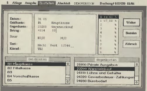 Das Buchführungsprogramm »Time is Money« (wir berichteten) liegt inzwischen in der verbesserten Version 1.1. vor. Alle eingetragenen Käufer können das Update kostenlos bei der C.A.S.H.-GmbH bestellen. Gegenüber der Vorgängerversion wurden einige wichtige Neuerungen implementiert. So stehen jetzt 27 statt neun Geldkonten zur Verfügung, die Gegenkontennummern sind nun fünfstellig. Schließlich hat die Firma auch die Zahl der Steuersätze von zwei auf zehn erhöht.