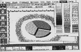 Befindet sich das Programm endlich ordentlich im Speicher, entfaltet sich vor dem staunenden Auge des Benutzers ein ausgeteiltes GEM-Desktop, ähnlich wie bei »Adimens ST« und »1st Word Plus«. Neben den üblichen Dialog- und Hinweisboxen sowie neben mehreren PullDown-Menüs hat es einige ungewohnte, aber dennoch sehr anwenderfreundliche Bedienungselemente aufzuweisen. Monochrome Malprogramme »protzen« in der Regel mit einer Fülle von Funktionen, die den Entwurf von Computerkunstwerken vereinfachen sollen. ST- Paint plus bietet dem Anwender auf dem Bildschirm drei Bedienungsbereiche. Zu der wohl jedem ST-Besitzer vertrauten Menüleiste gesellen sich eine Reihe von Icons mit unterschiedlichen Aufgaben sowie eine »Hilfsleiste« mit der Funktionstastenbelegung.