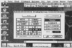 Während beim Drehen und Verzerren jeweils ein Umrißrahmen dargestellt wird, der mittels Mausbewegung zu verändern ist (das umgerechnete Bild erscheint erst nach Betätigen der entsprechenden Maustaste), führt ST-Paint plus die Größenänderungen und das Biegen unmittelbar nach Aufruf der Funktion aus. Grundlage zum Biegen bilden in erster Linie Sinus- und Cosinusberechnungen, für die der Winkelbereich von 0 bis 360 Grad und eine Amplitudengröße von 0 bis 400 Bildpunkten einstellbar sind. Zusätzlich lässt sich der Block über die Maus biegen, wobei die Mausbewegung die Verschiebung der einzelnen Zeilen und Spalten steuert. Ein gewisses Maß an Übung ist dabei unverzichtbar, da eine zu schnelle Mausbewegung Lücken im Bild hinterlässt. Wie bei fast allen Maloperationen lassen sich Mißerfolge mit der Undo-Taste rückgängig machen. Zur Bildmanipulation stehen jedoch nicht nur die Blockfunktionen bereit. Ein Icon auf dem Desktop symbolisiert ein Klemmbrett (mit computerdeutscheu Namen »Clipboard«), das wesentlich mehr bewältigt als lediglich die Ablage von Bildern. Seine Funktionen »verbrauchen« ein komplettes Pull-Down-Menü in der Menüleiste. Standardmäßig kann man selbstverständlich ein Bild ins Klemmbrett schieben und dort wieder herausholen. Darüber hinaus lässt sich der Inhalt eines Klemmbrettes über verschiedene logische Operationen mit einem Bild verknüpfen. Nach ein wenig Übung werden hierdurch überraschende Effekte erzielt. Die beiden nächsten Menüs beschäftigen sich vorwiegend mit diversen Einstellungsparametern. ST-Paint plus stellt sich ausgesprochen »einstellungsfreudig« dar. Die Einstellung verschiedener Strich- und Pinselstärken sowie deren Form und Größe, die Druckereinstellung oder die parametergesteuerte Bildbearbeitung sind nur einige Beispiele für diesen umfangreichen Funktionenkomplex. Für viele Funktionen stehen sogar eigene Editoren zur Verfügung.