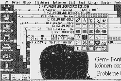ST-Paint plus benutzt zur Textdarstellung neben dem Systemzeichensatz zusätzlich noch GEM-Zeichensätze, wie sie zum Beispiel »Easy Draw« oder diverse Desktop Publishing-Programme einsetzen. Dies beinhaltet natürlich auch ein Schreiben mit Proportionalschrift. Leider fehlt ein Editor zum Generieren eigener Zeichensätze.