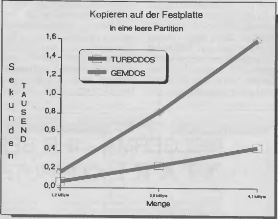 Turbo-DOS beschleunigt also die Datenübertragung vom ST zu seinen Massenspeichern in erheblichem Maße. Die in den Tabellen und Abbildungen dieses Artikels wiedergegebenen Meßwerte haben wir einer ausführlichen Dokumentation des Entwicklers Dominique Laurent entnommen. Das als Vergleich herangezogene GEM-DOS stammt aus dem französischen TOS vom 22.4.1987. Bei der Auswahl der Meßwerte war uns Alfred Scherff, der Systemsoftware-Experte aus der Raunheimer Atari-Zentrale behilflich. Im Mittel beträgt der Beschleunigungsfaktor 1,5fach beim Diskettenbetrieb und 3 bis 4fach bei der Arbeit mit der Festplattenstation. Dabei ist zu beachten, daß die Zeitvorteile mit zunehmender Partitionbelegung zunehmen.