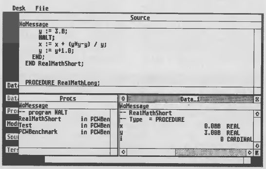 »SPC-Modula« von Advanced Applications Viczena ist nicht nur ein Compiler. Es ist ein integriertes Entwicklungspaket, bestehend aus Shell, Editor, Make-Utility, Debugger, sehr umfangreichen Bibliotheken, einem sogenannten »Pretty-Printer« und, natürlich, dem Compiler selbst. Als aufmerksamer Leser fragen Sie jetzt zu Recht nach dem Linker. Nun, den gibt es nicht — noch nicht. Doch werfen wir zunächst einen Blick auf die Benutzeroberfläche.