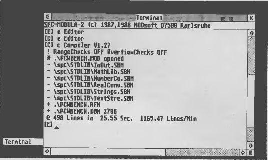 Nach diesem Fensterkonzept arbeiten alle Teile von SPC-Modula. Das von manchen geliebte, von vielen gehaßte Standardmodul InOut, das textorientierte Ein-/Ausgabefunktionen bereitstellt, verwendet ein eigenes, Terminal genanntes, Fenster. Da bis auf den Editor alle Teile des Entwicklungssystems über das InOut-Modul ausgeben, sind neben Texten des Anwenderprogramms auch die von Compiler, Shell und Make-Utility im Terminal-Fenster sichtbar. So läßt sich das Terminal-Fenster von SPC-Modula mit einem normalen textorientierten Terminal vergleichen.