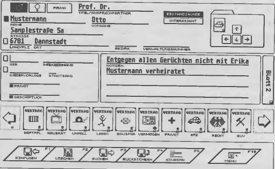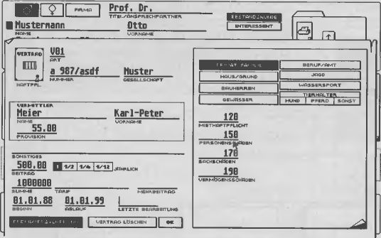 Einen Glanzpunkt des Programms stellen die Piktogram-me im unteren Bildschirmdrittel dar. Jedes Bild repräsentiert einen Versicherungsvertrag. Bis zu 60 Verträge lassen sich pro Kunde abschließen — jeweils zehn sehen Sie auf der Karteikarte gleichzeitig. In die Bilder haben die Programmautoren viel Arbeit und Mühe gesteckt. So erscheint etwa bei der Hausratsversicherung ein kleiner Fernseher auf dem Vertragsordner, bei der Lebensversicherung ein Strichmännchen und bei der Kraftfahrtversicherung ein Auto. Sie klicken nun einfach auf das Piktogramm und sofort öffnet sich der Vertragsordner. Wie ein aufgeschlagenes Buch ist das Blatt zweigeteilt. Die linke Seite enthält stets allgemeine Angaben (Zahlungsweise, Summe, Tarif, Vermittler und Nummer). Auf der rechten Seite stehen je nach Versicherungsart die einzelnen Vertragsdaten. In der Hausratversicherung gibt es zum Beispiel sieben Schalter, mit denen der Vertreter anwählt, ob das Reisegepäck oder Fahrrad mitversichert ist. Der Anwender muß nur einen Mausklick tätigen, um die Daten korrekt zu erfassen. Das ist nicht nur bedienerfreundlich, sondern hilft auch Fehler zu vermeiden. Man sieht nämlich alle Varianten auf dem Bildschirm, macht keine Tippfehler und schließt keinen logisch widersinnigen Vertrag ab. V-Manager achtet selbständig darauf, daß entweder eine Neuwertversicherung oder eine Neuwertversicherung mit dynamischer Summenanpassung ausgehandelt wird, aber nicht beides zugleich. Schließlich gibt es noch Textfelder, die der Benutzer mit der Tastatur ausfüllt.