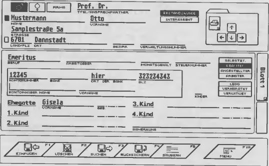 Besonders pfiffig gemacht ist das zweite Datenblatt, das ein Mausklick auf »Blatt 2« über das erste schiebt. Während der Kundenname im Blickfeld bleibt, erscheint zusätzlich ein Formular für die Berufsangaben, die Bankverbindung und die Namen und Geburtsdaten von maximal vier Kindern. (Was macht man beim fünften Kind?)