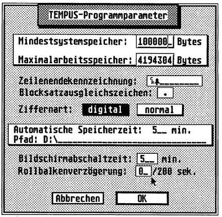 ASCII-Zeichen zur Übernahme in die Texte an. Alternativ kann der Benutzer viele Zeichen direkt über Tastenkombinationen oder als Dezimalwerte eingeben. Die beiden letzten Methoden funktionieren sogar in den Eingabefeldern der Tempus-Dialogboxen. Die meisten neuen Errungenschaften von Tempus 2.0 finden sich hauptsächlich in den Menüs »Text«, »Modus« und »Parameter«, soweit sie durch Mausbedienung zugänglich sind. Das Menü »Modus« steuert die Umschaltung zwischen zeilenorientierter Quelltextverarbeitung und den beiden Fließtexteinstellungen »linksbündig« und »Blocksatz«. In beiden Fließtextmodi formatiert Tempus die Texte direkt bei der Eingabe, sogar beim Einfügen und Ausschneiden von Texten. Natürlich in Tempus-Geschwindigkeit, also ohne merkbare Verzögerung. Wir haben die Direktformatierung einem extremen Test unterzogen. Mit ein paar Tricks und mehrfachem Kopieren erzeugten wir einen 495 KByte langen Text mit 6188 Zeilen ä 75 Zeichen, der weder Leerzeichen noch Zeilenvorschübe enthielt. Für Tempus bildete dieser Text praktisch ein einziges Wort. Zum Einfügen eines Zeichens in die erste Zeile benötigte Tempus nicht mehr als 6,4 Sekunden und hatte tatsächlich einen Buchstaben aus der Zeile 6188 in die Zeile 6189 geschoben.