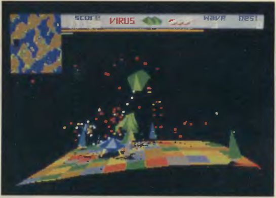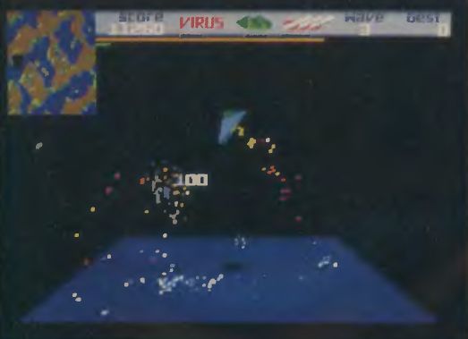 Noch bevor Sie sich vom Spielwitz des Programms überzeugen, überrascht Sie schon die außergewöhnliche Grafik des Demo-Modus. Virus stellt das Spielgeschehen in einer ungewöhnlichen 3D-Vogelperspektive dar: Sie sehen Ihr Raumschiff immer von schräg oben, wie von einer nebenherfliegenden Kamera gefilmt. Viele 3D-Spiele verwenden eine absolut flache Landschaft. Nicht so Virus. Die Viren-Landschaft hat Hügel und Abhänge, was den 3D-Effekt besonders unterstreicht. Ebenfalls neu für ein 3D-Spiel ist die Darstellung von Partikel-Systemen: der Auspuffstrahl, die Gischt auf den Wellen des Sees, die einer Dampfschwade gleichende Viren-Wolke oder die Rauchfahne eines explodierten Wracks sehen sehr realistisch aus. Und auch an Gags wurde nicht gespart: Fliegende Fische hüpfen aus dem Wasser des Sees, auch ein aus Versehen getroffener Baum brennt langsam ab. Trotz der Fülle von Details bleibt die 3D-Grafik sehr schnell, so daß der Spielfluß nicht gefährdet ist. Spielerisch ist Virus ein Actionspiel mit einer leichten strategischen Note. Je schneller Sie die Aliens vernichten, desto besser. Acht verschiedene Typen gibt es; die einen kümmern sich um das Verstreuen des Virus, die anderen versuchen Sie zu rammen oder beschießen Ihr Raumschiff aufs Heftigste. Aber nicht nur die angreifenden Raumschiffe sind eine Gefahr. Auch mangelnder Sprit kann Ihr Schicksal besiegeln. Wenn der Tank fast leer ist, müssen Sie auf Ihrem Landeplatz neuen Treibstoff holen. Der Gleiter ist recht empfindlich, Sie müssen ihn ganz sanft aufsetzen.