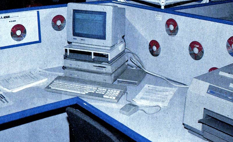 Bisher zwar auch nicht lieferbar, dafür aber zumindest in der Standvorführung zu sehen, waren einige (relativ) neue Atari-Produkte. Wie uns Sam Tramiel erklärte, ist das CD-ROM-Laufwerk schon lange produktionsreif, doch sei momentan zu wenig sinnvolle Software vorhanden. Zum derzeitigen Angebot gehört zum Beispiel das schweizerische Telefonverzeichnis und die Bibel. Zur Messe präsentierte Atari auch ein eigenes CD-ROM, das mit Programmen vollgepackt ist, darunter angeblich auch GFA-Basic und Ist Word Plus. Die Angebots-Situation soll sich bis zum Jahresende verbessern. Zu dieser Zeit will Atari dann auch die ersten Laufwerke ausliefern. Aus der PC-