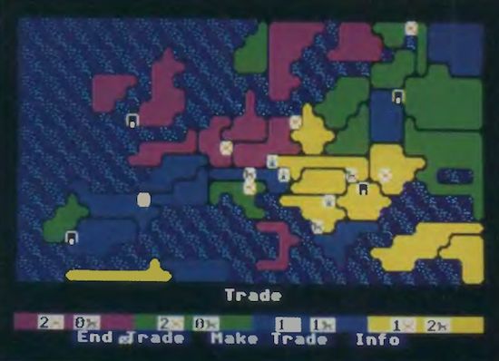 Zu Beginn einer Runde wÀhlt man sich eine von 19 Landkarten aus, die auf der Programm-Diskette gesichert sind. Sie können auch eigene Karten entwerfen und speichern oder sich vom Programm eine Zufallskarte generieren lassen. Jede Karte ist in einzelne LÀnder unterteilt. Danach wÀhlen die Spieler immer der Reihe nach LÀndereien aus, die zu Spielstart in ihren Besitz gehen.