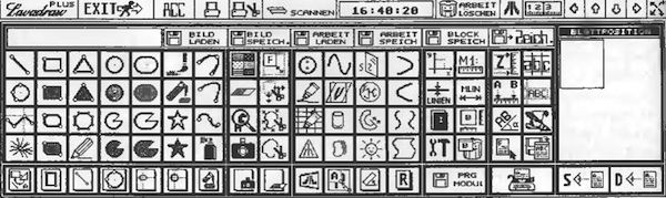 Um die Übersicht zu erleichtern, ist die Icon-Sammlung in mehrere Funktionsbereiche untergliedert. Ganz links sind die allgemeinen Zeichenbefehle angeordnet, daneben stehen die nützlichen Hilfsfunktionen. Es schließt sich die gut sortierte Effektabteilung an. Rechts davon sind die allgemeinen Parameter zugänglich. Des weiteren bietet Lavadraw im benachbarten Bereich mehrere Textfunktionen an. Dort rufen Sie auch externe Programmodule auf. Mit dem Blick auf die Blattposition sowie dem Zugriff auf die verschiedenen Überblicks-Modi schließt das Menü ab. In dem freien Feld unter dem EXIT-Symbol erscheint der jeweils angewählte Modus im Klartext. Das stellt besonders in der Einarbeitungsphase eine erhebliche Erleichterung dar.