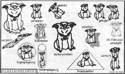 Die Abteilung »Special Effects« ist mit zwölf Symbolen reichlich bestückt. Von Konturverstärkung bis zu automatischer Schattengenerierung mit wählbarem Schattenmuster reicht die Palette. Einen Ausschnitt verzerren Sie auf vielfältige Weise. Brauchen Sie einen Bildteil leicht aufgerastert? Kein Problem. Per Verknüpfungsbefehl verwandelt Lavadraw eine schwarze Zeichnung in eine graue. Dazu stehen die schon von Lavadraw 3.1 bekannten Effekte wie Dreiecksverformung, Kugel- oder Tonnenspiegelung bereit. Bild 2 vermittelt Ihnen einen kleinen Eindruck, welche Fähigkeiten hinter diesen Befehlen stehen.