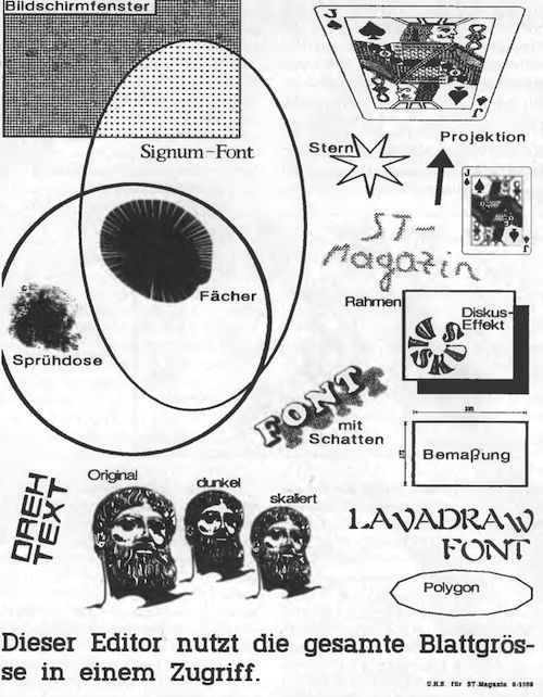 Natürlich verfügt Lavadraw auch über Textfunktionen. Mit diversen verschiedenen Schriftarten fügen Sie beliebigen Text in Ihre Grafik ein. Die Textimportfunktion gestattet, in Verbindung mit dem Aufruf des von Ihnen favorisierten Texteditors, auch größere Textpassagen bis 100 Zeilen komfortabel und bequem einzubringen. Dabei überfordern Sie das Programm auch bei Formatierungswünschen, wie links- oder rechtsbündig, mittenzentriert oder Blocksatz, nicht. Zur direkten Texteingabe bietet das Programm einen Einzeileneditor, der maximal eine Bildschirmbreite bearbeitet. Ein mehrzeiliges Pendant erlaubt die Textpositionierung über das gesamte Blatt. Sollten die vorhandenen Zeichensätze nicht genügen, eröffnet der zum Lieferumfang gehörige Zeichensatzeditor den Zugriff auf Signum-Fonts. Alternativ lassen sich auch beliebige Bildausschnitte in einen Font integrieren.
