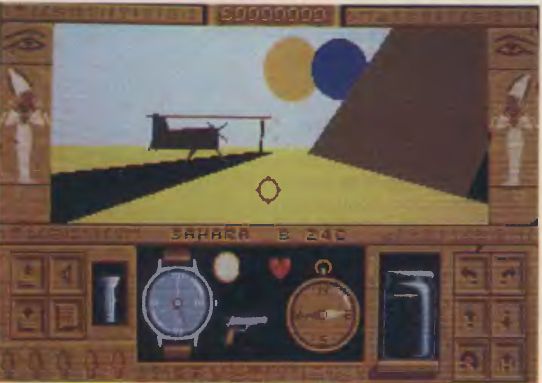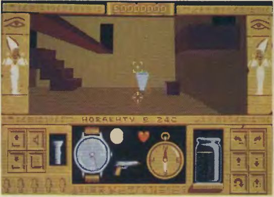 Das Hauptfenster nimmt den größten Teil des Bildschirms ein. Hier sehen Sie in der aktuellen Blickrichtung Ihre Umgebung, und zwar in feinster dreidimensionaler Grafik (»Freescape«). Unterhalb des Hauptfensters finden Sie eine Art Höhenmesser, der Ihre Position über dem Meeresspiegel in Ellen anzeigt. Die oberste Kammer mit dem Schrein des Sonnengottes Ra liegt genau 72 Ellen hoch.
