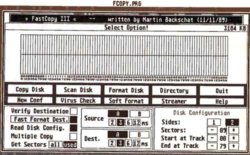 Mit der neuen Funktion »New Conf« kopieren Sie eine Diskette und ändern gleichzeitig das Format. In der rechten unteren Box stellen Sie dabei das zu erzeugende Diskettenformat ein. Diese Funktion ist sehr nützlich, um beispielsweise einseitige Disketten auf ein doppelseitiges Format umzukopieren oder um aus einer 9- eine 11-Sektoren-Diskette zu machen. Mit »Virus?« testen Sie Ihre Diskette auf Boot-Viren und eliminieren diese gegebenenfalls. Dabei zeigt Ihnen Fastcopy auf Wunsch auch den Boot-Sektor an. Durch die Funktion »Soft Format« löschen Sie das Inhaltsverzeichnis und die FATs auf der Diskette. Dies ist äußerst praktisch, um volle Disketten schnell zu löschen. Zudem können Sie bei dieser Gelegenheit ein neues Diskettenformat im Boot-Sektor eintragen und so etwa schnell zwischen ein- und zweiseitigen Formaten umschalten. Die Funktion »Streamer« kopiert eine Festplatten-Partition auf eine oder mehrere Disketten und umgekehrt. Dabei kopiert Fastcopy nach Wunsch alle oder nur die belegten Sektoren. Für eine Sicherheitskopie einer vollen 10-MByte-Partition auf 14 Disketten benötigt Fco-py nur etwa 15 min. Sollte der Anwender Probleme mit der Handhabung von Fastcopy haben, so steht ihm die Funktion »Help« zur Seite, die alle wichtigen Einstellungen und Funktionen kurz erklärt.
