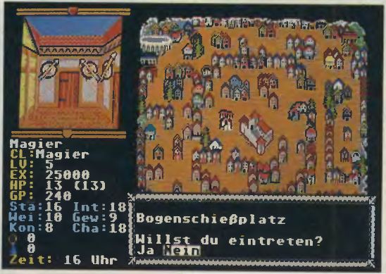 Nach Betreten der Stadt nimmt der Stadtplan ein Drittel der Bildschirmfläche ein, hier sieht man den Helden joystickgelenkt durch die Straßen wandern. Sehr praktisch: Das ganze Spiel ist menügesteuert, man braucht fast nie die Hand vom Freudenstab zu nehmen. Eine weitere Grafik zeigt das Gebäude, in dem sich der Kämpfer befindet. Zwei Textfenster informieren über den Zustand des Helden und die Handlungen, zwischen denen er sich entscheiden kann.
