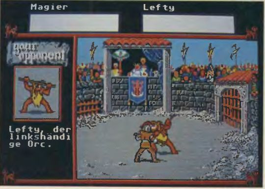 Verschiedene Action-Elemente sind integriert: So muß der Spieler vom Lager in die Stadt reiten. Wer dabei allzuoft vom Pferd fällt, verliert Gesundheitspunkte. In der Arena muß sich der Held im Kampf gegen Orks und andere Ungeheuer bewähren — im Prinzip ein einfaches Kampfspiel. Am Schießplatz schließlich geht es um ein gutes Auge und eine ruhige Hand am Joystick, ähnlich wie bei Sportspielen.