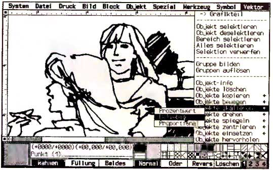 Die im Vektormodul fertiggestellten Grafiken übernehmen Sie problemlos in den pixelorientierten Zeichenteil, wo Ihnen alle bereits aus Mega Paint II bekannten Bearbeitungsformen offenstehen. Darüber hinaus bietet die Professional-Version noch einiges mehr: So läßt sich beispielsweise während der Arbeit eine der vier Zeichenebenen als Hintergrundbild einblenden. Vier verschiedene Helligkeitsstufen stehen dabei zur Verfügung. Ein zusätzliches Menü unterstützt den Anwender mit »diversen Funktionen für den Büroalltag«. Wie uns Thomas Maier, Geschäftsführer von Tommy Software, telefonisch verriet, verbergen sich hinter dieser unverfänglichen Bezeichnung einige faustdicke Überraschungen: So scannen Sie mit Mega Paint Professional beliebige Formulare und definieren für diese eine Eingabemaske: Das Ausfüllen geschieht dann mit dem programmeigenen Texteditor, den Ausdruck übernimmt der Laserdrucker. Damit bekommen Sie jeden Papierkrieg in den Griff. Eine Importfunktion erlaubt das direkte Lesen von Adimens-Datensätzen. Die darin enthaltenen Texte lassen sich mit Mega Paint-Bildern vermischen. Der Ausdruck erfolgt vollautomatisch. Das Zusammenstellen von Serienbriefen bzw. -bildern erfordert so nur noch wenige Mausklicks. Der obligatorische Taschenrechner wird voraussichtlich auch implementiert sein.