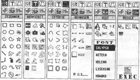 Die obere Bildschirmzeile beherrscht das Hauptmenü. Den Abbildungsmaßstab der zu bearbeitenden Zeichenfläche verändert der Grafik-Freund über entsprechende Icons in drei Stufen. Daneben stehen die verschiedenen Ein- und Ausgabe-Verfahren Diskette, Scanner und Drucker zur Verfügung. Die folgende Gruppe gestattet den Zugriff auf die wichtigsten Mausparameter, informiert über die aktuellen System-Faktoren und erlaubt die Nutzung von Accessories. Rechts davon steht der Mülleimer zum Loschen der Zeichnung parat, die Aktivierung des »Augen-Symbols« bewirkt die Übersicht auf die gesamte Fläche, und die sich überkreuzenden Pfeile lösen eine mausabhängige freie Positionierung des »Bildschirmfensters« auf der Zeichenfläche aus. Das Notausgangssymbol schließlich führt zum Programmende.