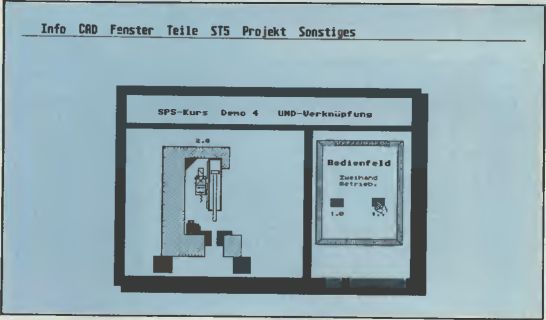 Die herausragendste Eigenschaft von SPS-ST: Der gesamte Steuerungsablauf kann vorab am Bildschirm gezeichnet (z.B. ein Aufzug), mit den nötigen Steuer- und Regelungselementen versehen und in der SPS-ST5-Sprache programmiert werden. Anschließend läßt sich der ganze Ablauf der Steuerung sowohl visuell am Bildschirm als auch per Debugger und letztlich über die Ausgabeports vollziehen. Der Anwender hat die Möglichkeit, den kompletten Funktionsablauf am Bildschirm zu verfolgen, was sich beispielsweise so zeigt, daß sich der Aufzug von Etage zu Etage bewegt und dabei seine Positionsinformation per Wegaufnehmer dem Programm mitteilt.