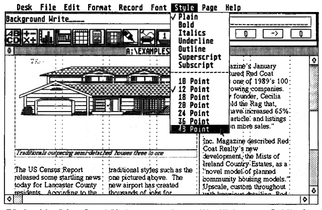 Unter »GDOS« stehen verschiedene Schriften und Schriftattribute zur Verfügung, dabei wird am Bildschirm bereits angezeigt, was hinterher auch auf dem Papier erscheint (WYSIWYG). Ausgeliefert wird das Programm mit 9-Nadel-Druckertreibern (Epson-Standard) und einem 24-Nadel-Treiber. Als einziges hochwertiges Ausgabemedium wird der Atari-Laser unterstützt. GDOS-Treiber für andere Drucker können jedoch nachbestellt werden. Die in Kürze erscheinende deutsche Programmversion 1.1, die wir in einer der nächsten Ausgaben ausführlich besprechen werden, gibt es zum Preis von 249 Mark.