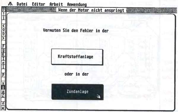 Doch 1st Card möchte ja mehr sein als eine Datenbank — es wagt sich in den Bereich KI/Expertensysteme. Kurz wiederholt: Ein Expertensystem stellt umfangreiches Fachwissen zur Verfügung, das logisch organisiert ist. Die erste Karte formuliert das Problem und stellt eine Frage, auf die zwei oder mehr Antworten möglich sind. Je nachdem, wie die Antwort ausfällt, erscheint die nächste Karte, die wieder Fragen stellt. Das geht so lange, bis das Problem durch Fragen eingekreist ist. Die Antwort führt zur letzten Karte im System, die nicht mehr weiterverknüpft ist. Beispiel: Auf die Frage, ob der Motor des Wagens nicht anspringt, kann man mit »ja« oder »nein« antworten. Je nachdem, wie die Antwort ausfällt, verweist ein Pfeil auf das nächste Feld.