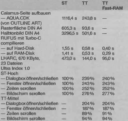 Ein Beispiel: Man läßt Calamus eine Seite für 2540 dpi aufbauen. Auf der Seite ist nur ein Halbtonbild. Ein Mega ST4 benötigt fast 3300 s. Der TT schafft dies in 500 s. Dies ist immerhin Faktor 6,5. Der 16-MHz-TT brauchte 850 s. Damit ist auch klar, daß der 32-MHz-TT um einiges schneller ist als der ursprünglich geplante Rechner.