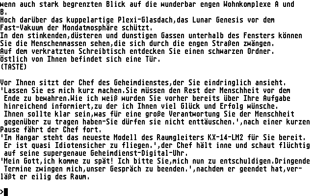 Denn der Autor hat zugunsten einfacher Handhabung gänzlich auf einen Parser verzichtet. Die Kommunikation wird über zwanzig Handlungsoptionen, die dem Programm mittels Tastendruck mitgeteilt werden, geregelt.