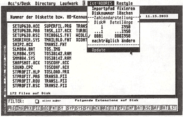 Innerhalb weniger Minuten baut »Indexus« eine flexible Disketten-, Programm- und Dateienverwaltung unter »1st Adress« auf. Der universelle Verwalter benötigt nicht einmal eine volle Sekunde, um eine Datei aus 3300 ausfindig zu machen. Dabei lassen sich bis zu 36000 Disketten verwalten. Zur »MGL«-Software gehört eine »1st-Adress«-taugliche Maskendatei.