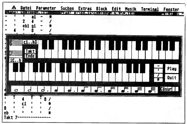Die Vektornotengrafik läßt sich auch als Pixelgrafik auf Disketten ablegen und in Grafikprogrammen nachbearbeiten. Das Programm ist GEM-eingebunden und verwaltet bei vollem MIDI-Tonumfang von zehn Oktaven bis zu 144 Töne gleichzeitig. Die Wiedergabe erfolgt aus dem Arbeitsspeicher des Ataris. Besonderes Feature: Die MIDI-Software läuft auch auf dem TT.