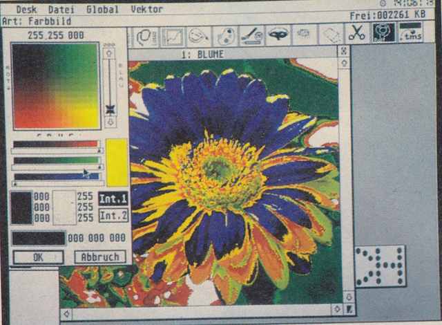 Selbstverständlich ist Calamus SL farbfahig. Intern arbeitet das Programm mit einer Farbtiefe von 24 Bit. Leistungsfähige Dither-Verfahren und Farbpaletten-Substitutionen passen die Farbausgabe an die jeweils angeschlossene Ausgabeeinheit an. So unterstützt Calamus SL sämtliche monochromen Auflösungsmodi von ST und TT, den 4-Bit-Modus des TT (16 Farben, 640 x 480 Pixel) sowie 8-Bit-Farbgrafikkarten für ST und TT. Der Betrieb einer in das TT-Betriebssystem eingebundenen 24-Bit-True-Color-Grafikkarte ist bereits jetzt im Programm vorgesehen.