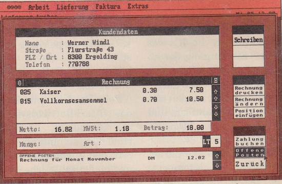 Merkur überwacht Lieferungen an bis zu 1000 Early-Food-Kunden, verwaltet die Löhne von 15 Mitarbeitern, schreibt Rechnungen, Mahnungen, organisiert das Lastschriftverfahren, überprüft Zahlungseingänge und gibt Statistiken aus. Einziger Haken: Das Lohn- und Fakturierungsprogramm benötigt eine Festplatte und 4 MByte Speicher. Interessenten erhalten nähere Informationen bei Werner Windl, Flurstr. 43, 8300 Ergolding.