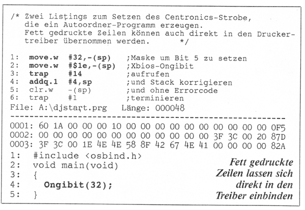 Bisher einzige Abhilfe: Die Einschaltreihenfolge - erst Drucker, dann Computer - muß penibel eingehalten werden. Unsere Mini-Listings auf dieser Seite zeigen, daß es dennoch geht, Ansonsten hilft Ihnen das darunterstehende MCI-Listing weiter, das ein Auto-Ordner-Programm erzeugt und die Eigenwilligkeiten wettmacht. Der Deskjet verfügt übrigens bei der Textausgäbe über eine HP-LaserJet-Emulation. Entsprechende Treiberprogramme gibt's mittlerweile für nahezu alle Programme. Für alle Fälle läßt sich auch eine Epson-FX-Emulation per Cartridge nachrüsten. Die bietet neben gestochen scharfen Epson-FX-Fonts allerdings lediglich eine Grafikausgabe mit einer Auflösung von 180 dpi und zeigt besonders kuriose Eigentümlichkeiten bei grafischem Text, wie ihn beispielsweise Signum unterstützt: Buchstaben werden dabei aus einer Reihe unterbrochener und unterschiedlich dicker Balken zusammengesetzt.