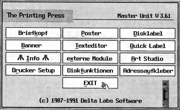 Wer’s ganz groß braucht, wird mit der Funktion »Banner« zufrieden sein. Text wird damit in fast beliebiger. Länge auf Endlospapier gedruckt. Visitenkarten druckt Printing Press ebenso unproblematisch wie Adreßaufkleber. Zu diesen Designerfähigkeiten gesellen sich noch diverse Diskettenfunktionen, ein Fonteditor und das Antivirenmodul, (mn)