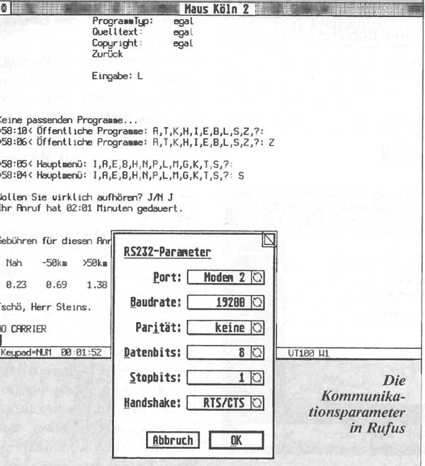 FĂŒr jeden Eintrag lassen sich eigene Wahlstrings und eine Modem-Initialisierung definieren. Dadurch ist fĂŒr jede Box das Modem optimal eingestellt. Vollautomatisches Login â wie STalker â unterstĂŒtzt Rufus leider immer noch nicht, dazu mĂŒssen Sie schon einen eigenen Batch schreiben. Ein Batch ist in diesem Fall ein Programm in der integrierten Sprache Rufus-Talk. Die ist zwar recht umfangreich, erreicht aber dennoch nicht den Umfang von BackTALK aus STalker. Trotzdem erledigt Rufus-Talk praktisch alles, was Sie von einem Terminal-Programm erwarten. SĂ€mtliche Parameter lassen sich abfragen und umsetzen âja selbst Dateitransfers bereiten keine Probleme. Die Sprache umfaĂt rund 130 Befehle. Auch Unterprogramme und einfache arithmetische Operationen sind möglich. Die Syntax Ă€hnelt BASIC â AnfĂ€nger haben es hier wahrscheinlich etwas leichter als mit BackTALK. Ein weiterer Vorteil: Batches lassen sich direkt â also ohne kompilieren â ausprobieren. Batches programmieren Sie am besten im Editorfenster und testen ihn sofort aus. Das Handbuch ist gut, ĂŒbersichtlich und bietet keinen Grund zur Klage. Rufus wird der kommerziellen Zunft das Leben schwer machen. Wer Bernhards ĂŒbertrumpfen möchte, muĂ schon einiges zu bieten haben, (mn)